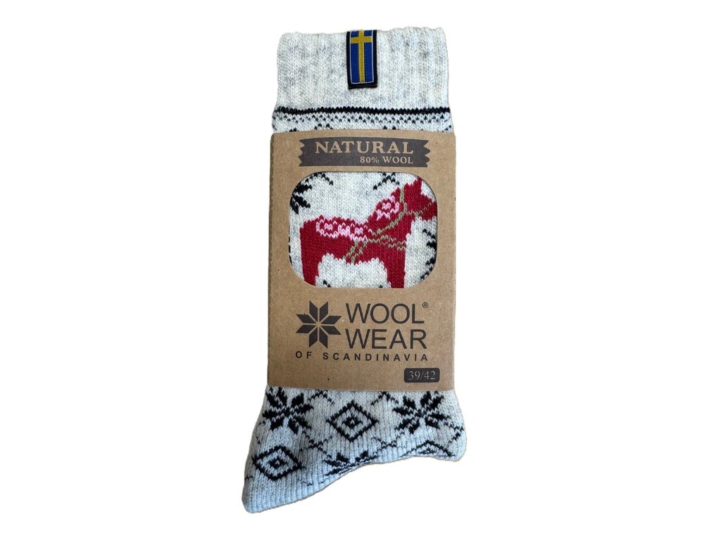 Tyto vlněné ponožky spojují 80 % čisté vlny, poctivou skandinávskou výrobu a krásný severský design s jemnými sněhovými hvězdami a ikonickým švédským koníkem DALAHÄST.